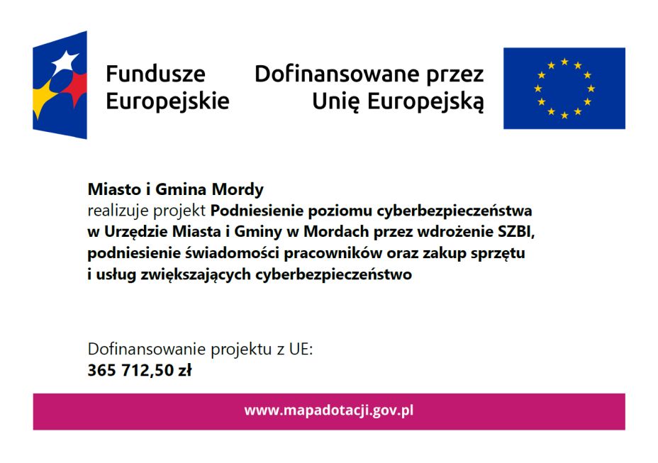 Nazwa zadania: Podniesienie poziomu cyberbezpieczeństwa w Urzędzie Miasta i Gminy w Mordach przez wdrożenie SZBI, podniesienie świadomości pracowników oraz zakup sprzętu i usług zwiększających cyberbezpieczeństwo